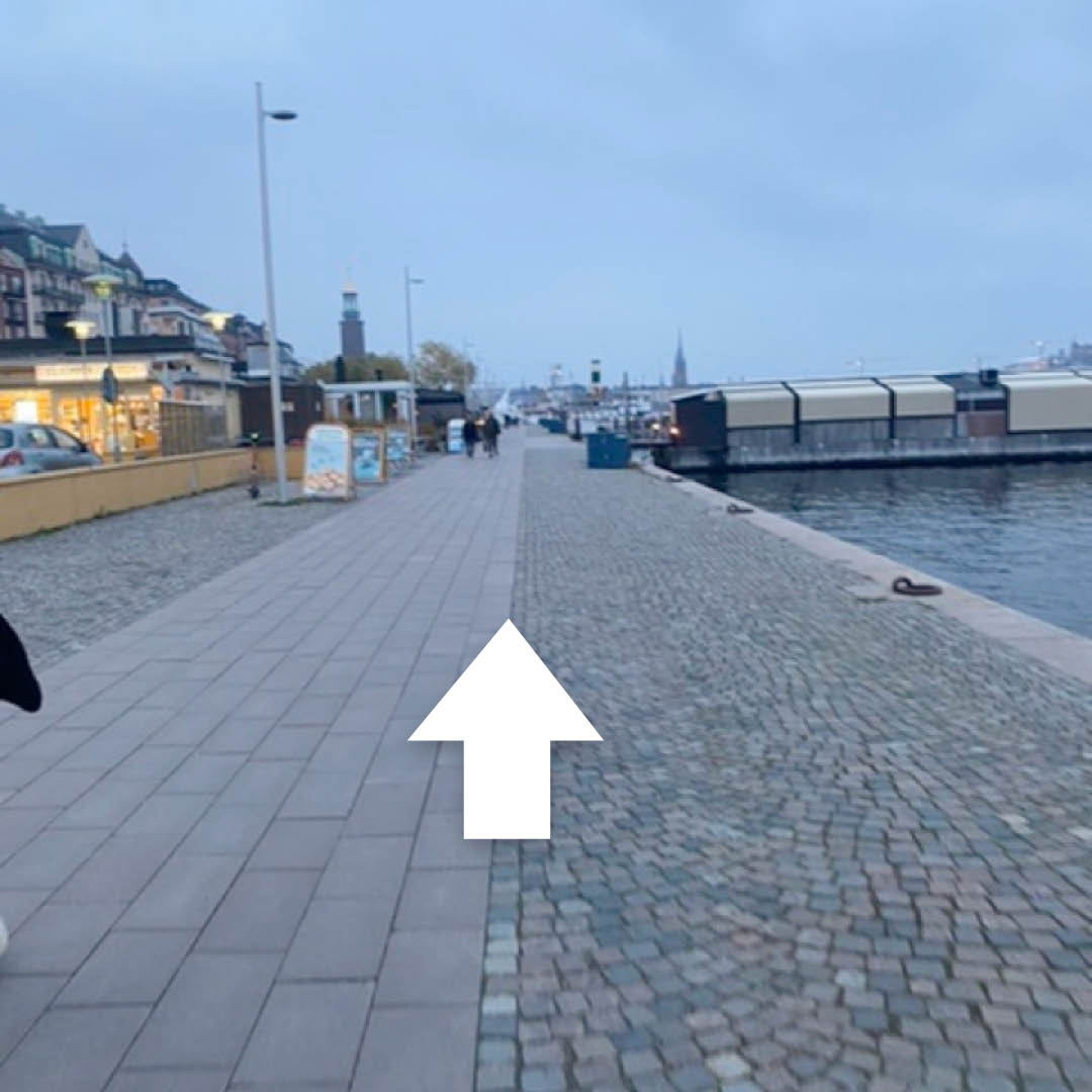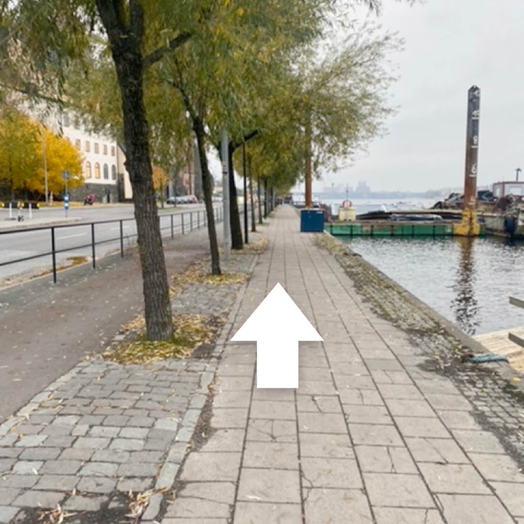 Ställ dig så att du har Kungsträdgården på din vänstra sida och Hamngatan i ryggen och ta Jussi Björlings Allè rätt fram. Ta vänster när parken tar slut och håll dig längs med Kungsträdsgårdens kortsida. När kortsidan tar slut tar du höger och tar dig över gatan Bild 2 (se upp för trafik) och ner till Strömkajen Bild 3. Fortsätt längs kajen och se till så du har vattnet på din högra sida Bild 4.