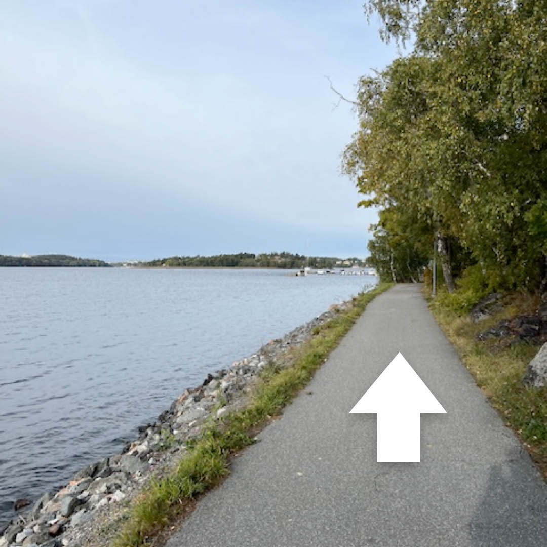 Ta dig över Lilla Lidingöbron och ta sedan vänster Bild 2. Fortsätt rakt fram längs Islinge Hamnväg Bild 3 till du kommer till en Bensinmack på vänster sida. Efter Bensinmacken sväng upp spå gångvägen snett vänster Bild 4 och ta sen vänster igen in på stigen Bild 5. Fortsätt rakt fram med vattnet på din vänstra sida.